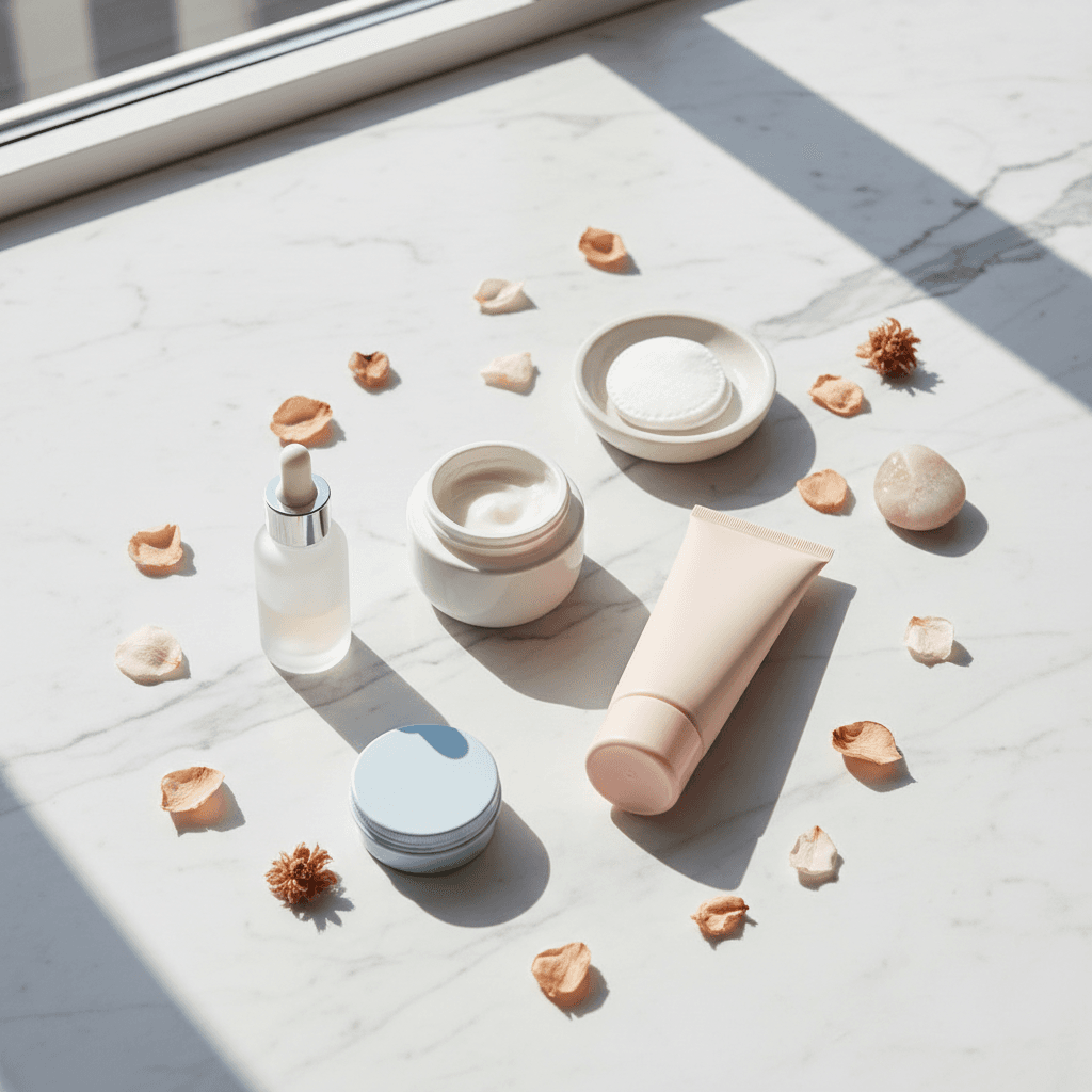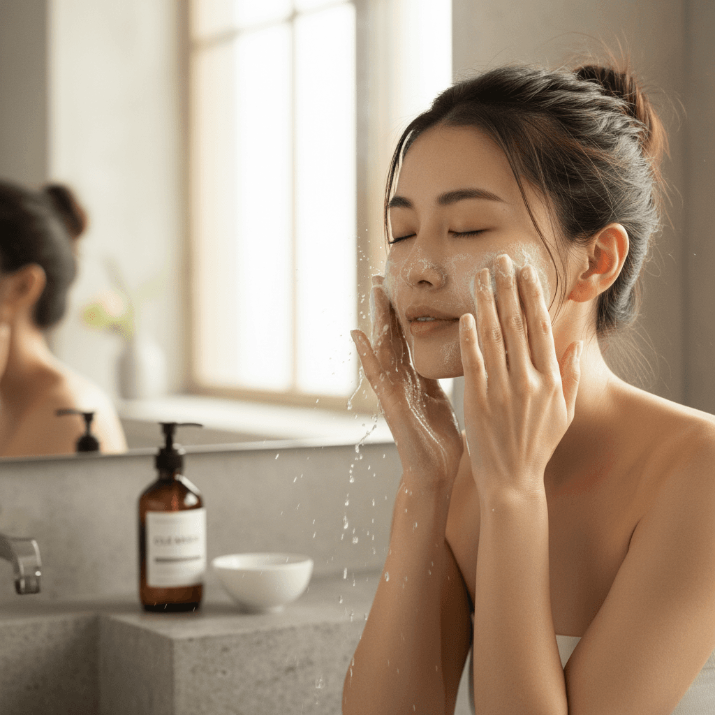 Tutorial prático de rotina com água micelar para pele seca. Cada passo explicado com produto sugerido, desde a limpeza suave até a proteção solar e hidratação.