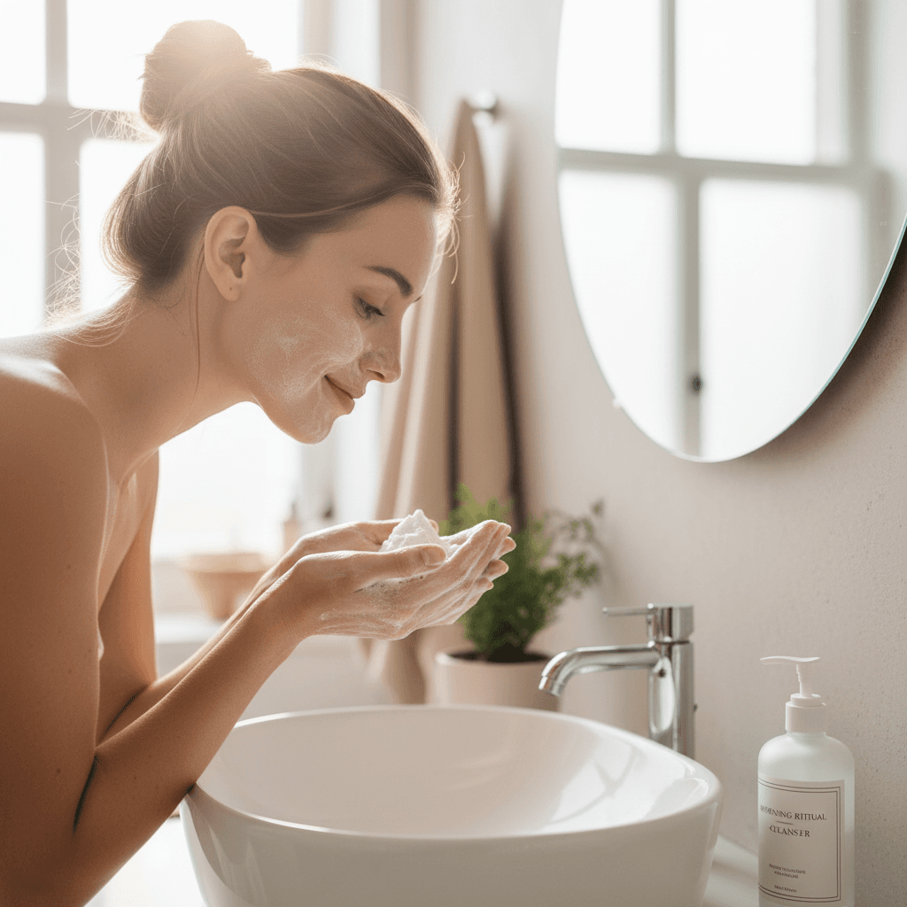 Tutorial prático de rotina com água micelar para pele sensível. Cada passo explicado com produto sugerido, desde a limpeza suave até a proteção solar.